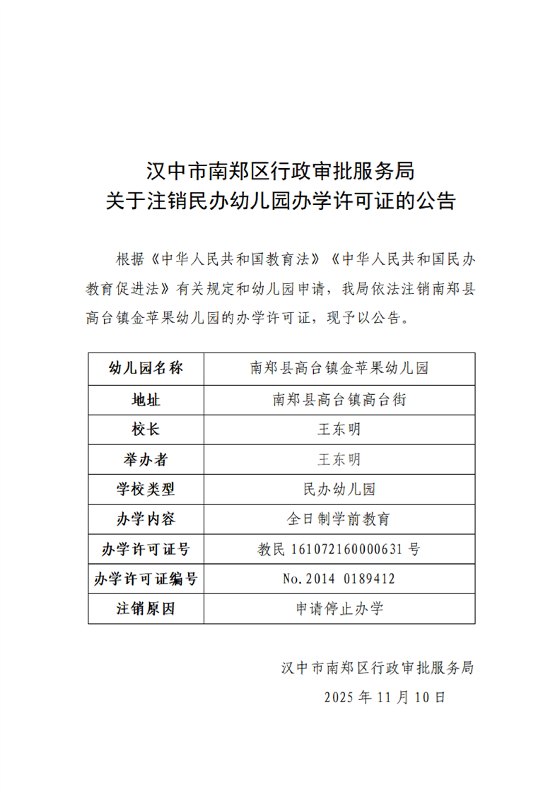 汉中市南郑区行政审批服务局关于注销民办幼儿园办学许可证的公告