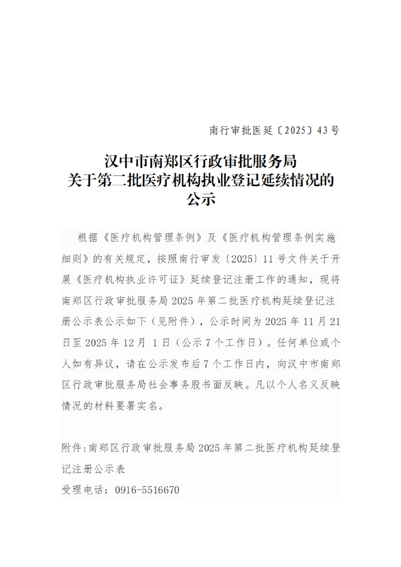 汉中市南郑区行政审批服务局关于第二批医疗机构执业登记延续情况的公示