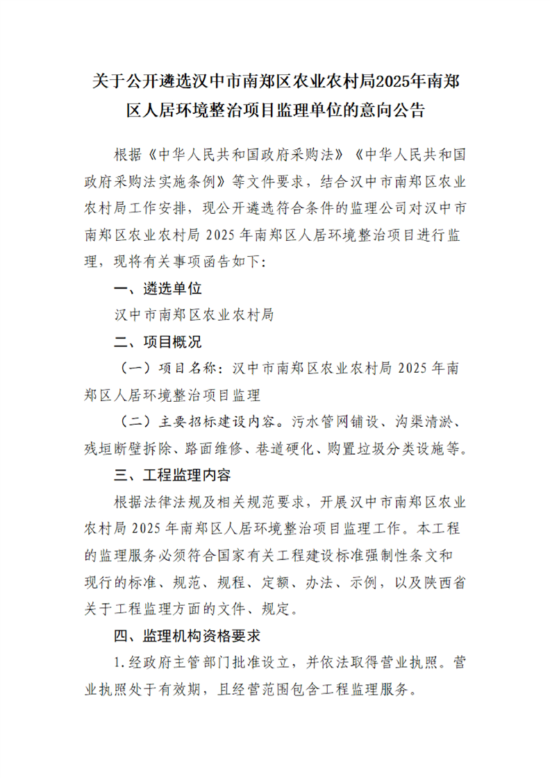 关于公开遴选汉中市南郑区农业农村局2025年南郑区人居环境整治项目监理单位的意向公告