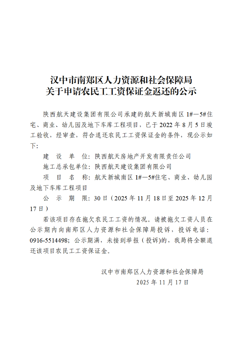 汉中市南郑区人力资源和社会保障局关于申请农民工工资保证金返还的公示