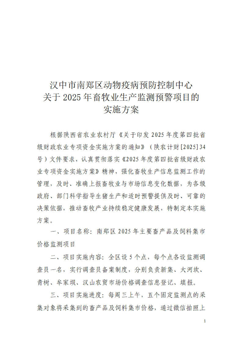 汉中市南郑区动物疫病预防控制中心关于2025年畜牧业生产监测预警项目的实施方案