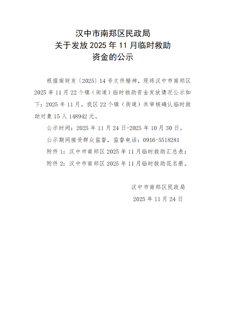 汉中市南郑区民政局关于发放2025年11月临时救助资金的公示