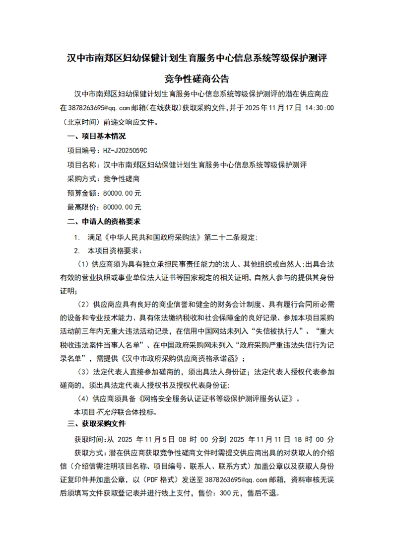 汉中市南郑区妇幼保健计划生育服务中心信息系统等级保护测评竞争性磋商公告
