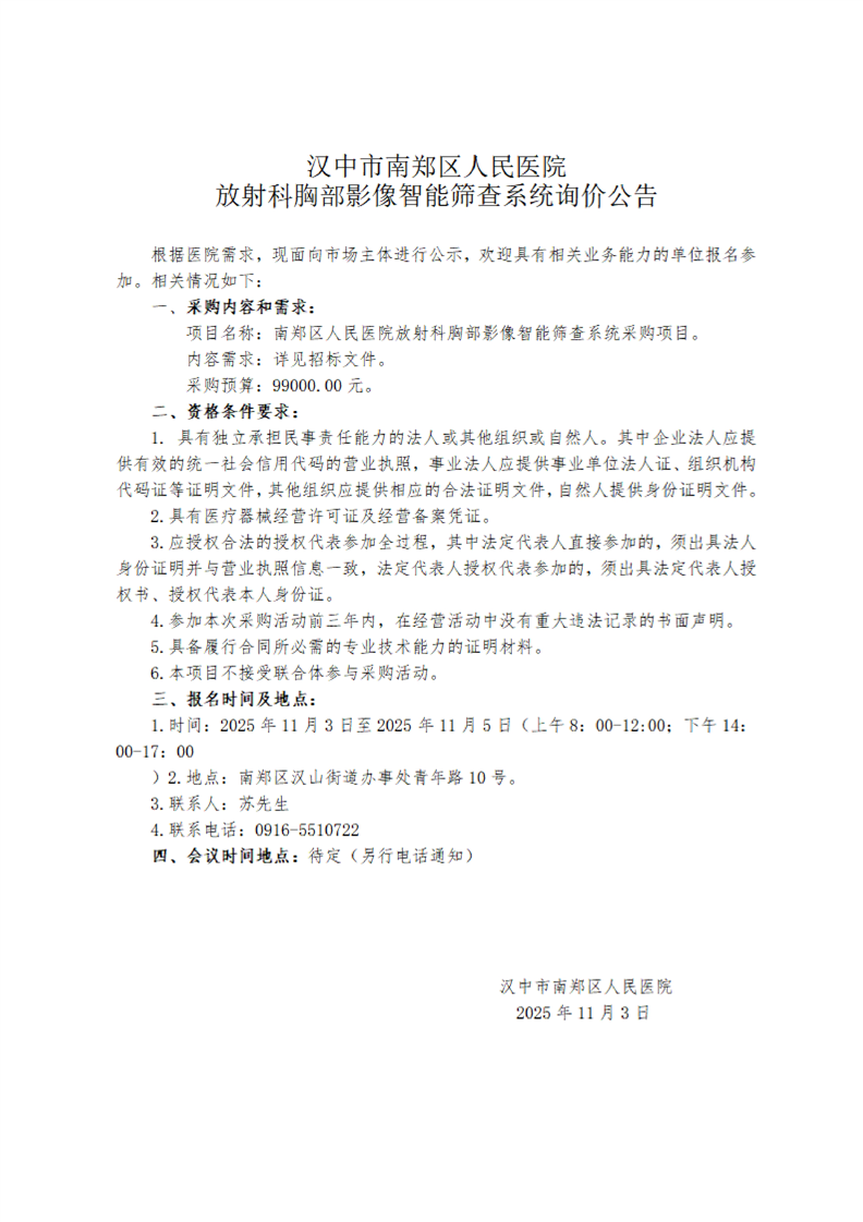 汉中市南郑区人民医院放射科胸部影像智能筛查系统询价公告