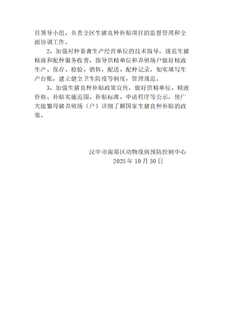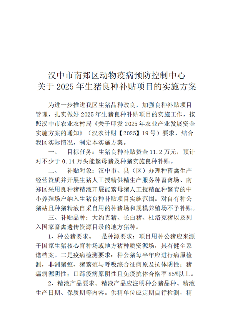 汉中市南郑区动物疫病预防控制中心关于2025年生猪良种补贴项目的实施方案