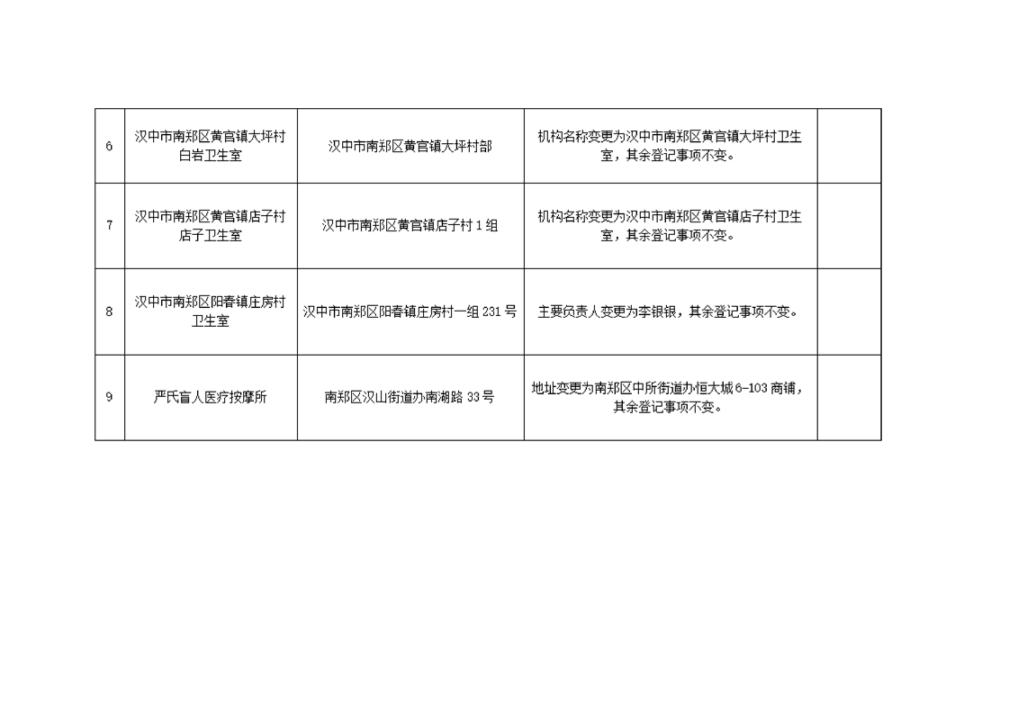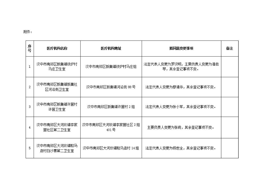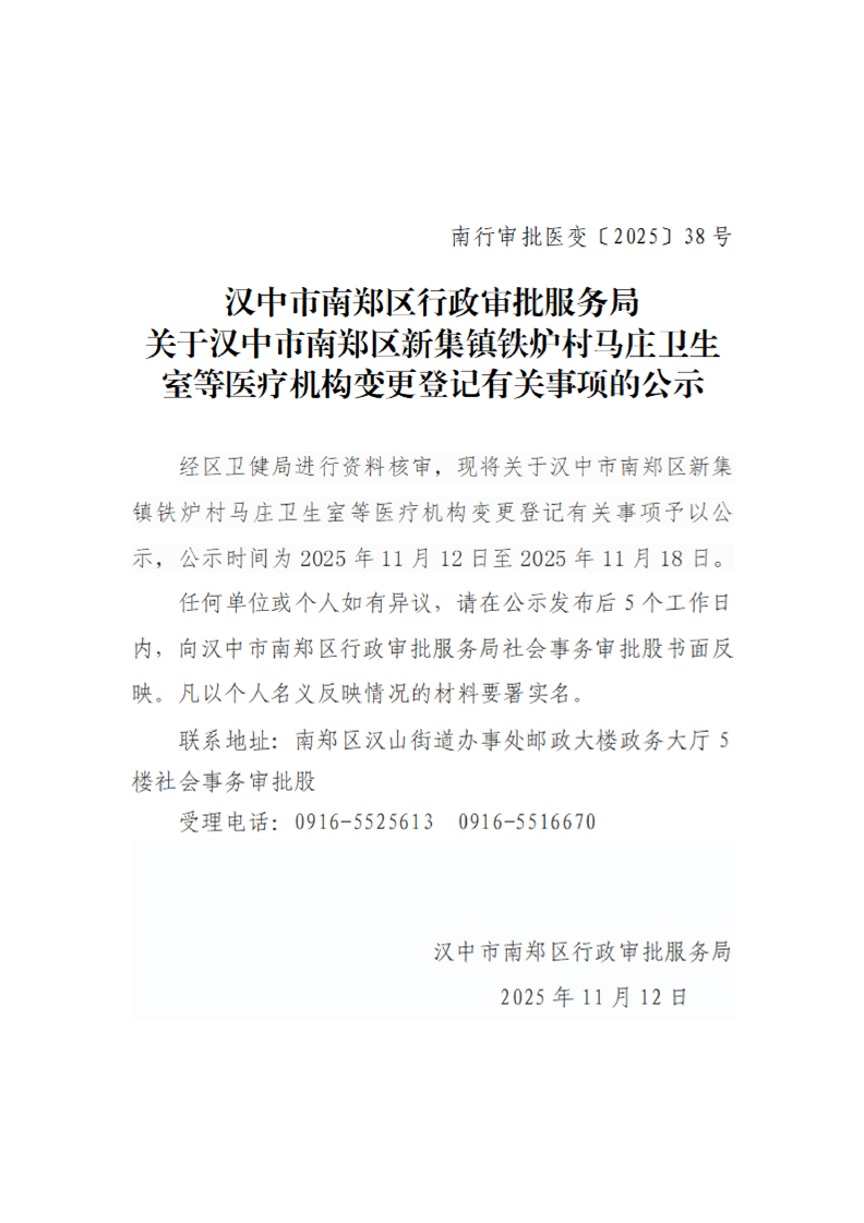 汉中市南郑区行政审批服务局关于汉中市南郑区新集镇铁炉村马庄卫生室等医疗机构变更登记有关事项的公示