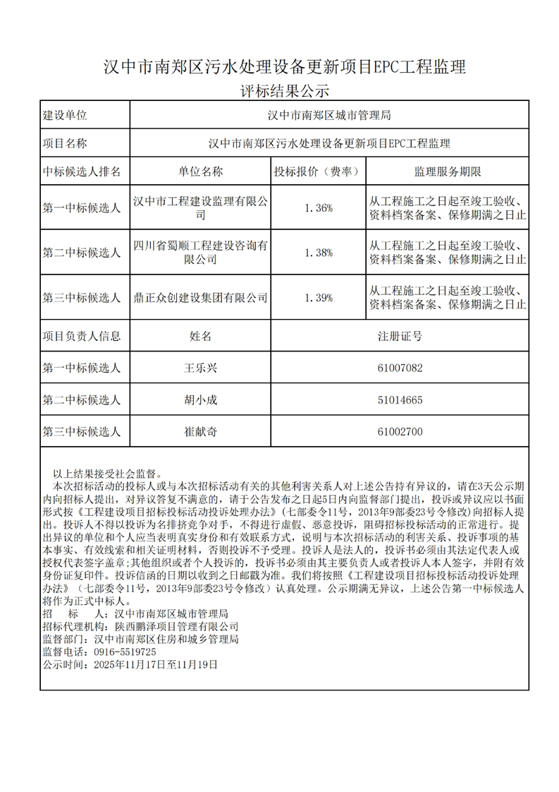 汉中市南郑区污水处理设备更新项目EPC工程监理评标结果公示