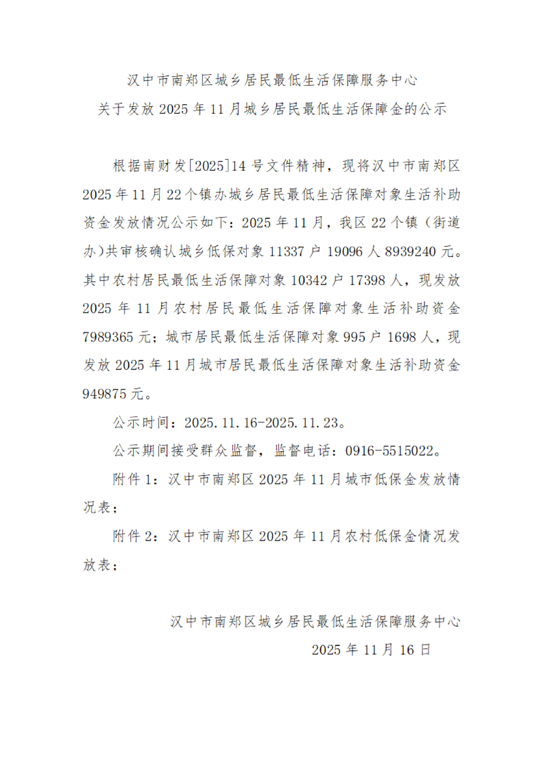 汉中市南郑区城乡居民最低生活保障服务中心关于发放2025年11月城乡居民最低生活保障金的公示