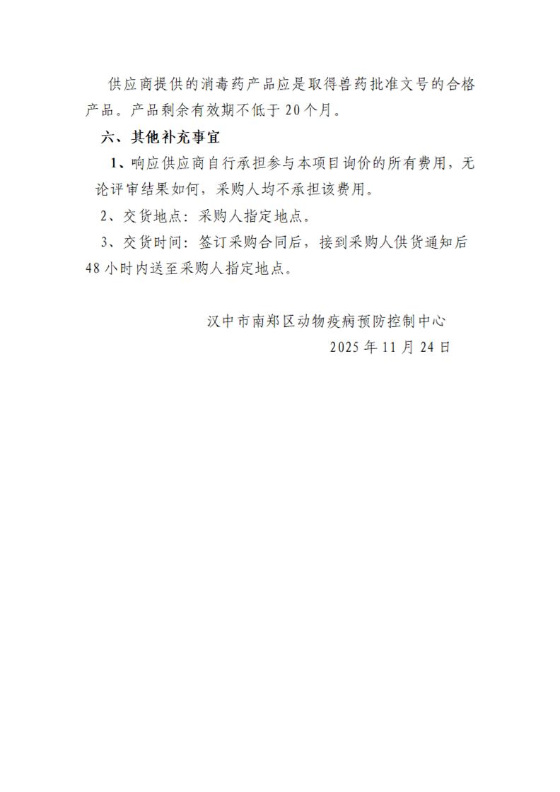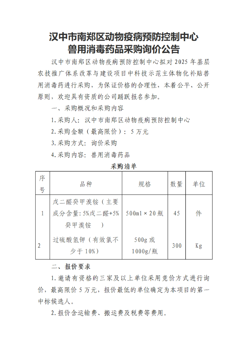 汉中市南郑区动物疫病预防控制中心兽用消毒药品采购询价公告
