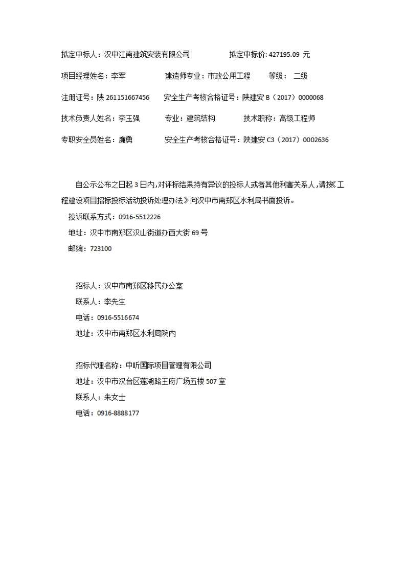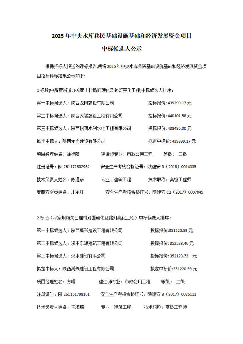 2025年中央水库移民基础设施基础和经济发展资金项目中标候选人公示