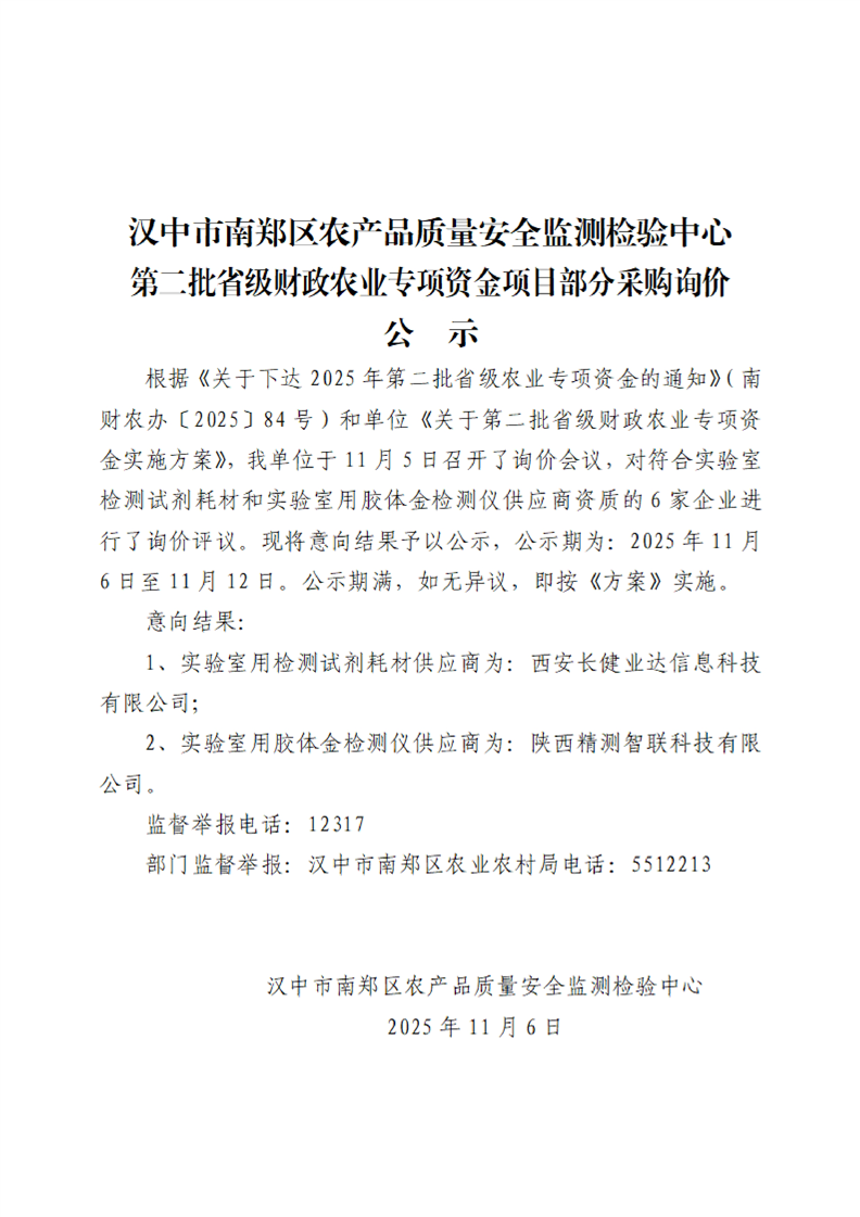 汉中市南郑区农产品质量安全监测检验中心第二批省级财政农业专项资金项目部分采购询价公示