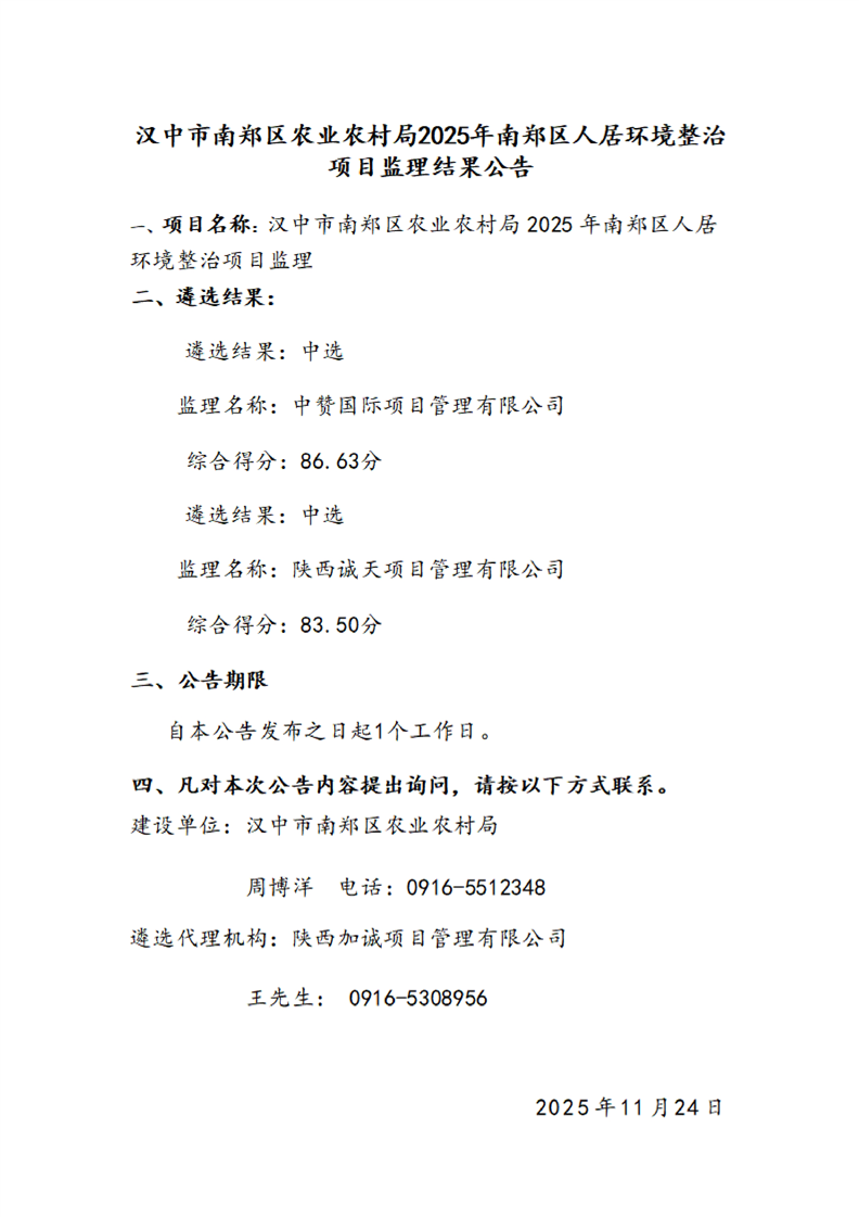 汉中市南郑区农业农村局2025年南郑区人居环境整治项目监理结果公告