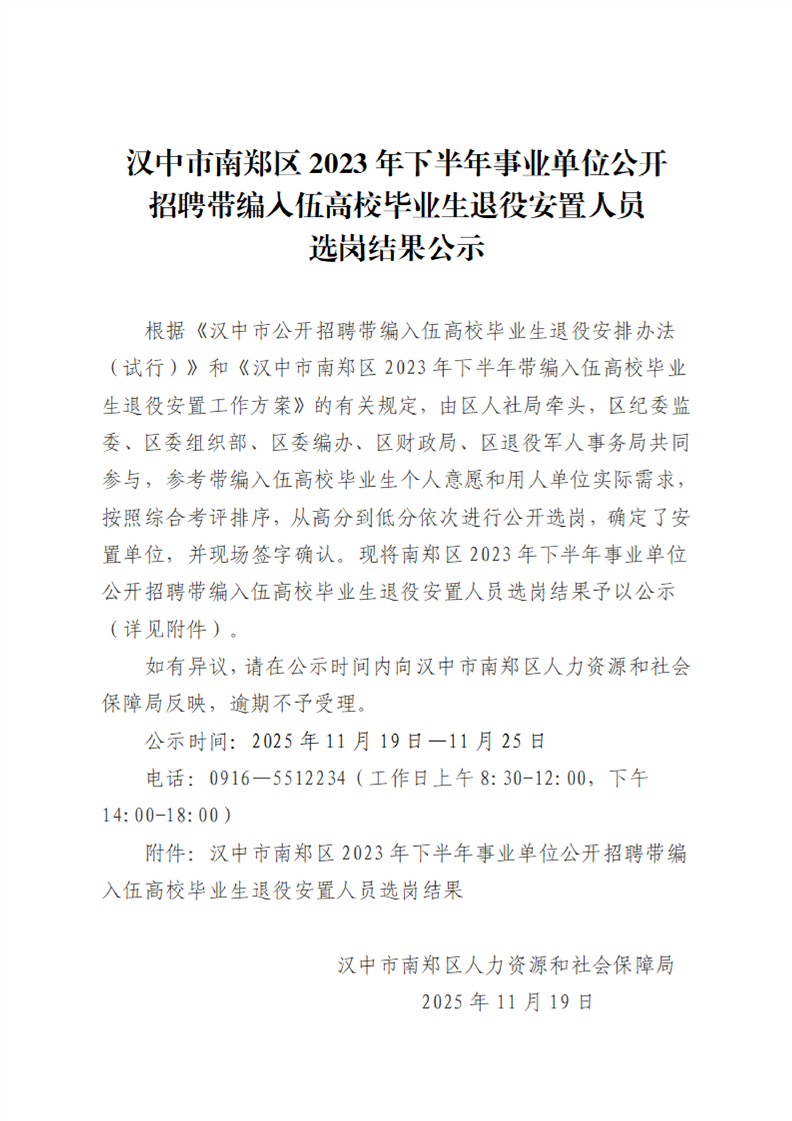 附件:汉中市南郑区2023年下半年事业单位公开招聘带编入伍高校毕业生退役安置人员选岗结果