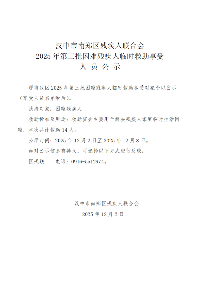 汉中市南郑区残疾人联合会2025年第三批困难残疾人临时救助享受人员公示