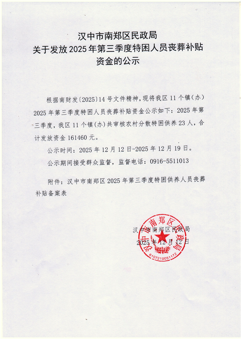 关于发放2025年第三季度特困人员丧葬补贴资金的公示