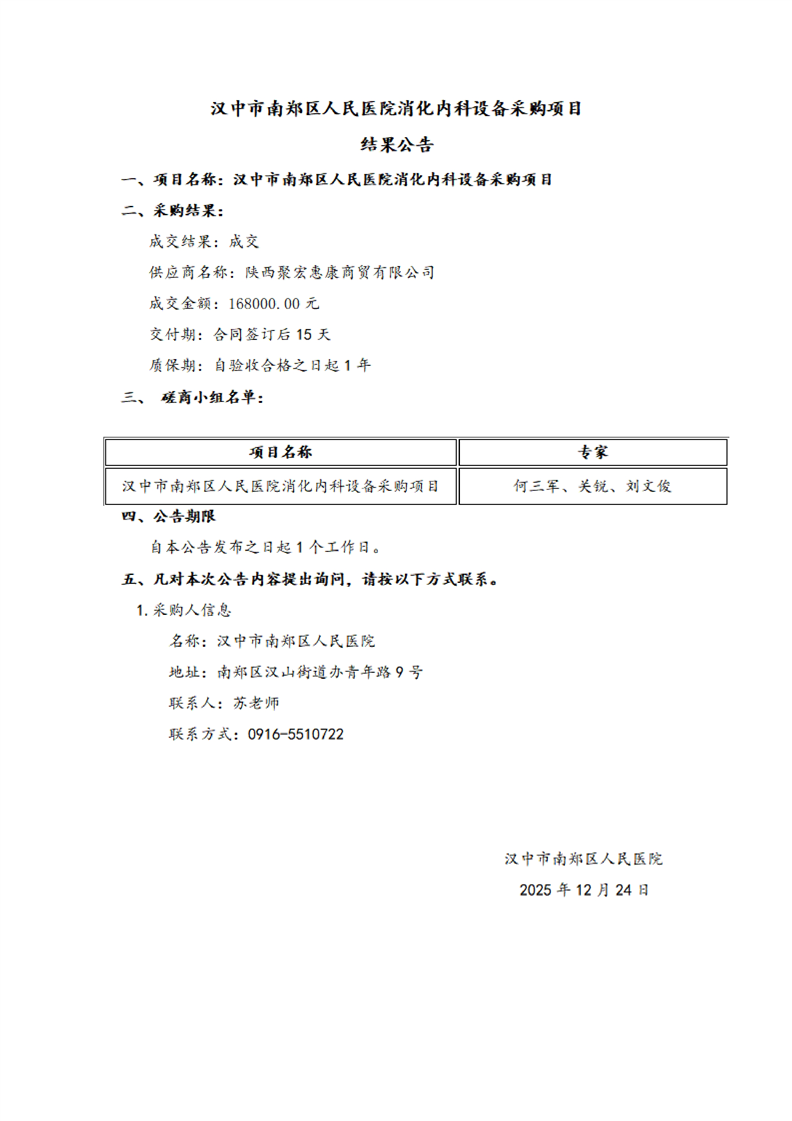 汉中市南郑区人民医院消化内科设备采购项目结果公告