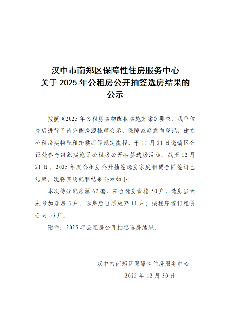 汉中市南郑区保障性住房服务中心关于2025年公租房公开抽签选房结果的公示