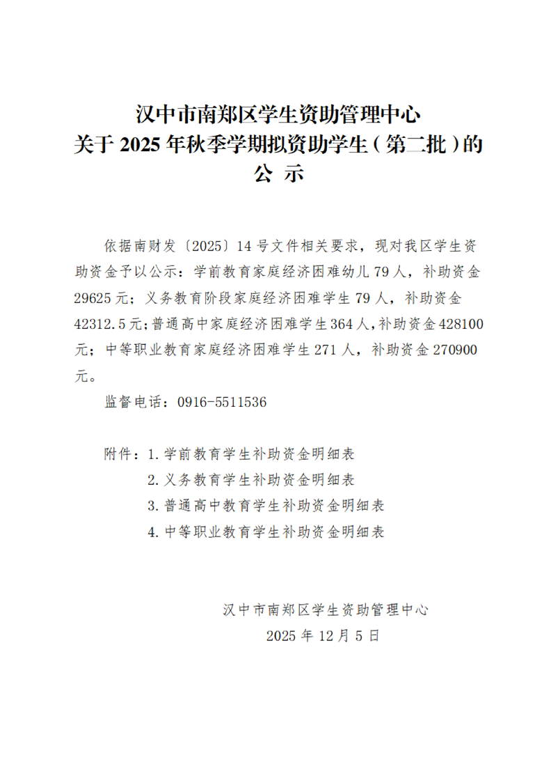 汉中市南郑区学生资助管理中心关于2025年秋季学期拟资助学生(第二批)的公示