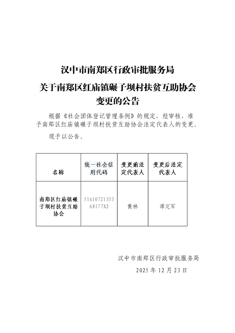 汉中市南郑区行政审批服务局关于南郑区红庙镇碾子坝村扶贫互助协会变更的公告
