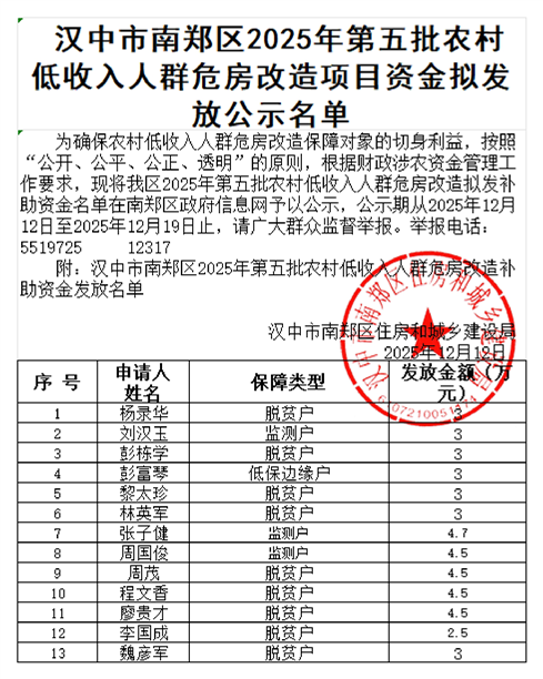 汉中市南郑区2025年第五批农村低收入人群危房改造项目资金拟发放公示名单