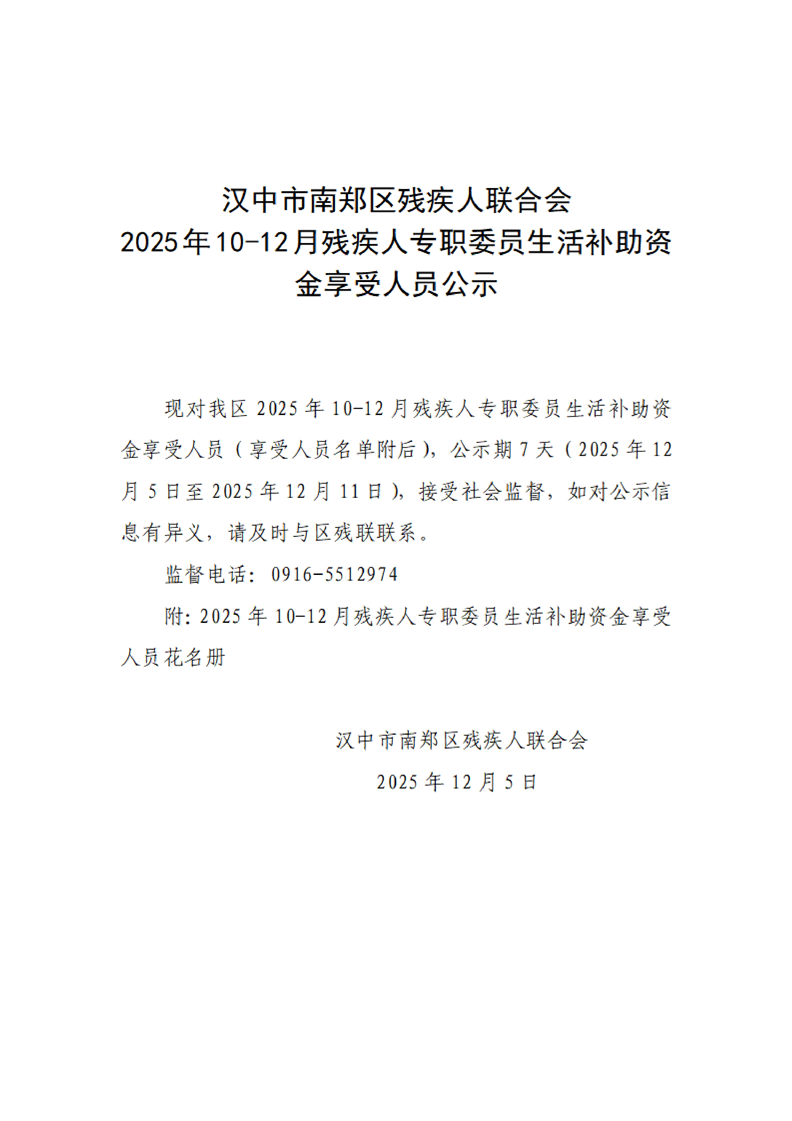 汉中市南郑区残疾人联合会2025年10-12月残疾人专职委员生活补助资金享受人员公示