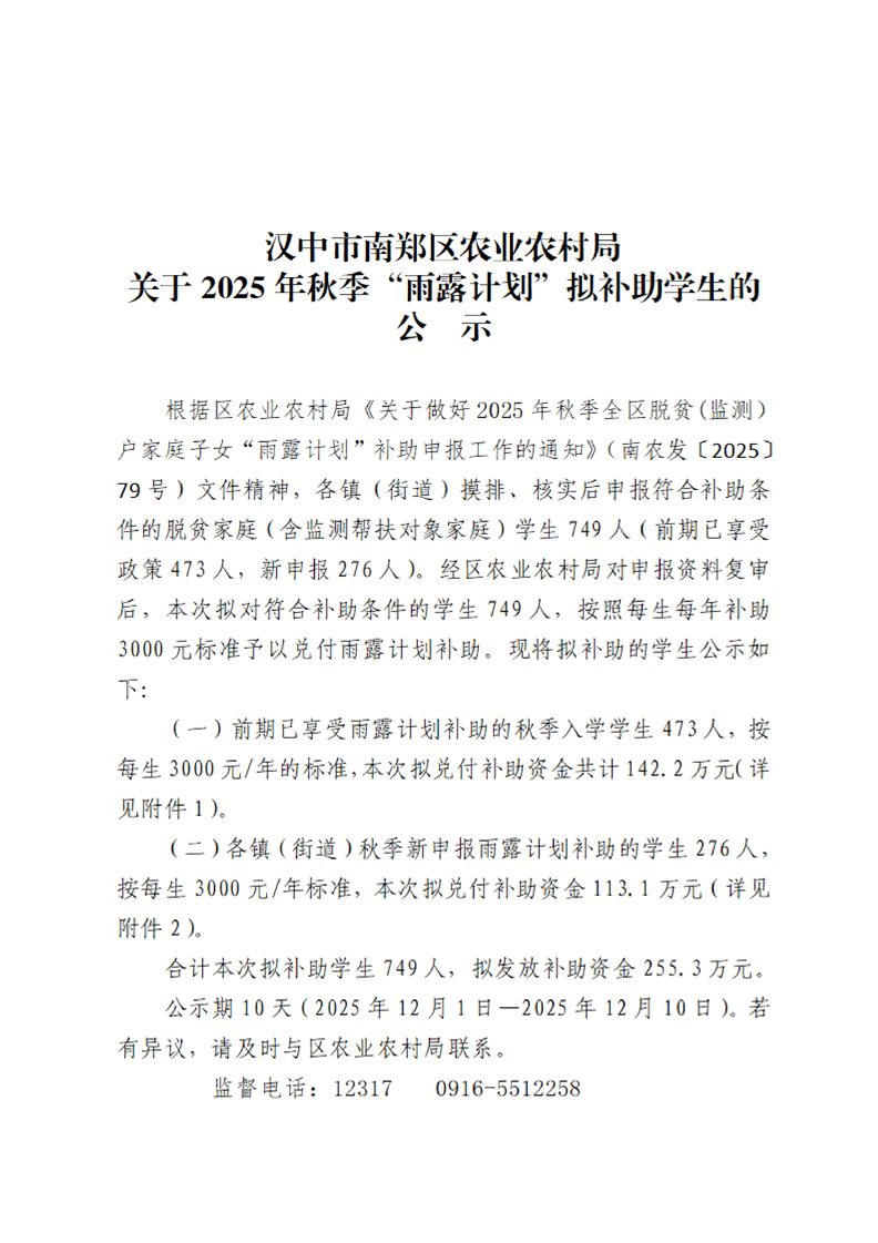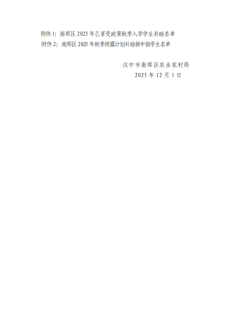 汉中市南郑区农业农村局关于2025年秋季“雨露计划”拟补助学生的公示