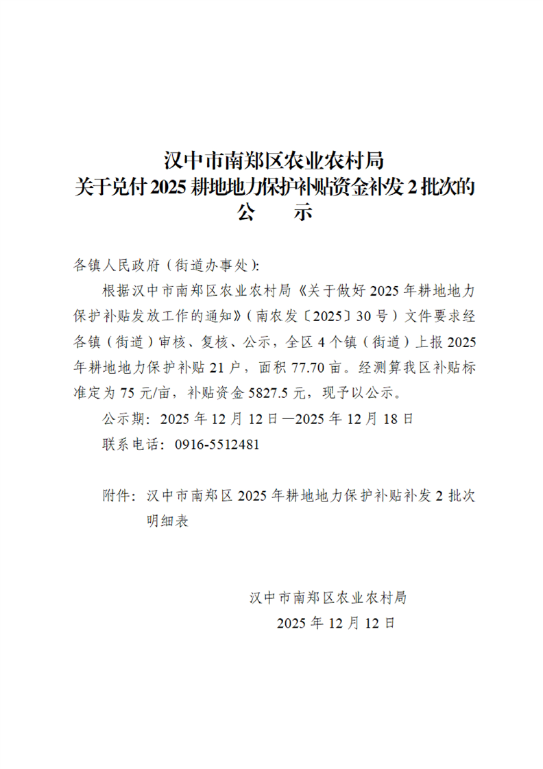 汉中市南郑区农业农村局关于兑付2025耕地地力保护补贴资金补发2批次的公示
