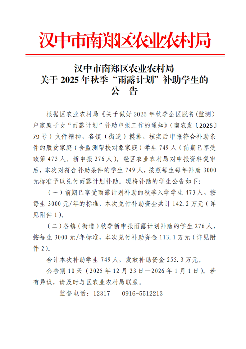 汉中市南郑区农业农村局关于2025年秋季“雨露计划”补助学生的公告