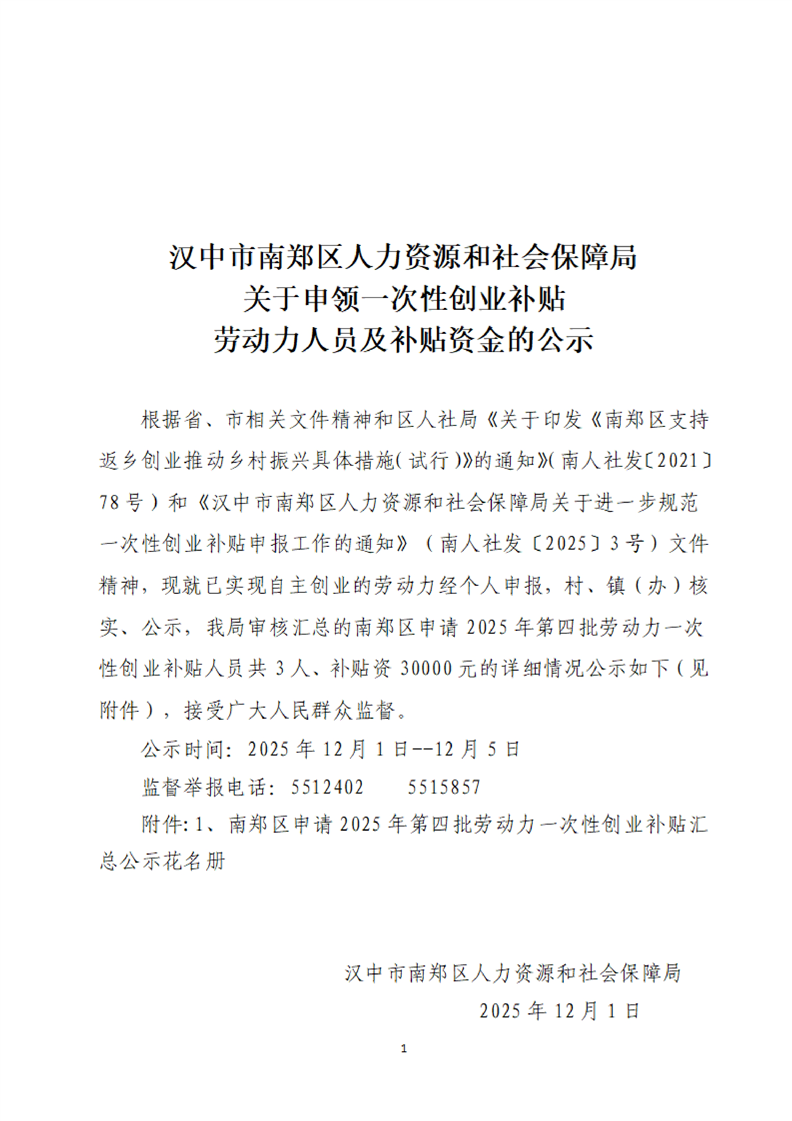 汉中市南郑区人力资源和社会保障局关于申领一次性创业补贴劳动力人员及补贴资金的公示