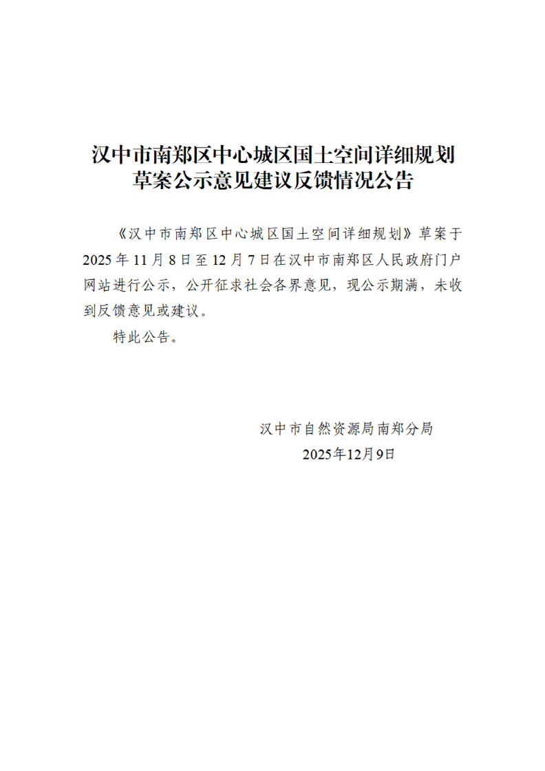 汉中市南郑区中心城区国土空间详细规划草案公示意见建议反馈情况公告