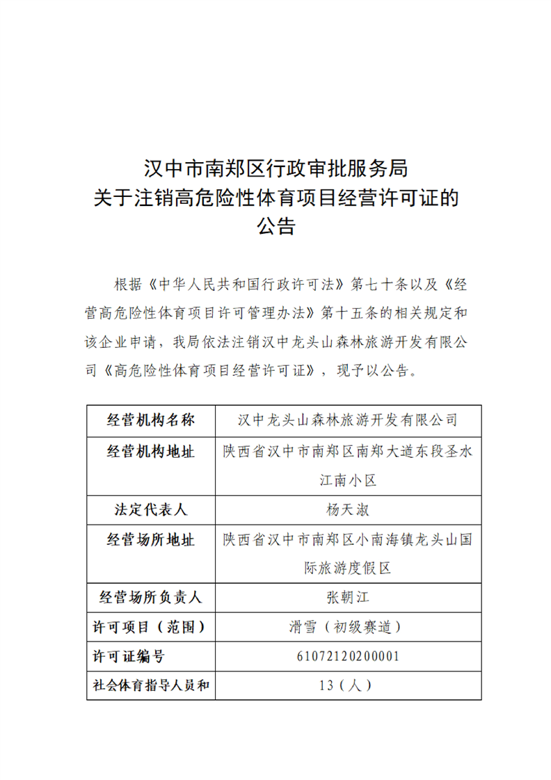 汉中市南郑区行政审批服务局关于注销高危险性体育项目经营许可证的公告