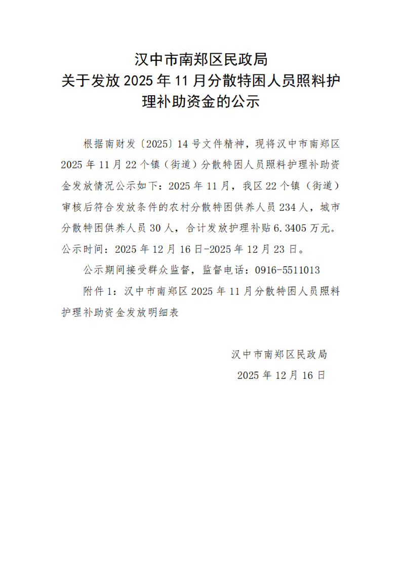 汉中市南郑区民政局关于发放2025年11月分散特困人员照料护理补助资金的公示