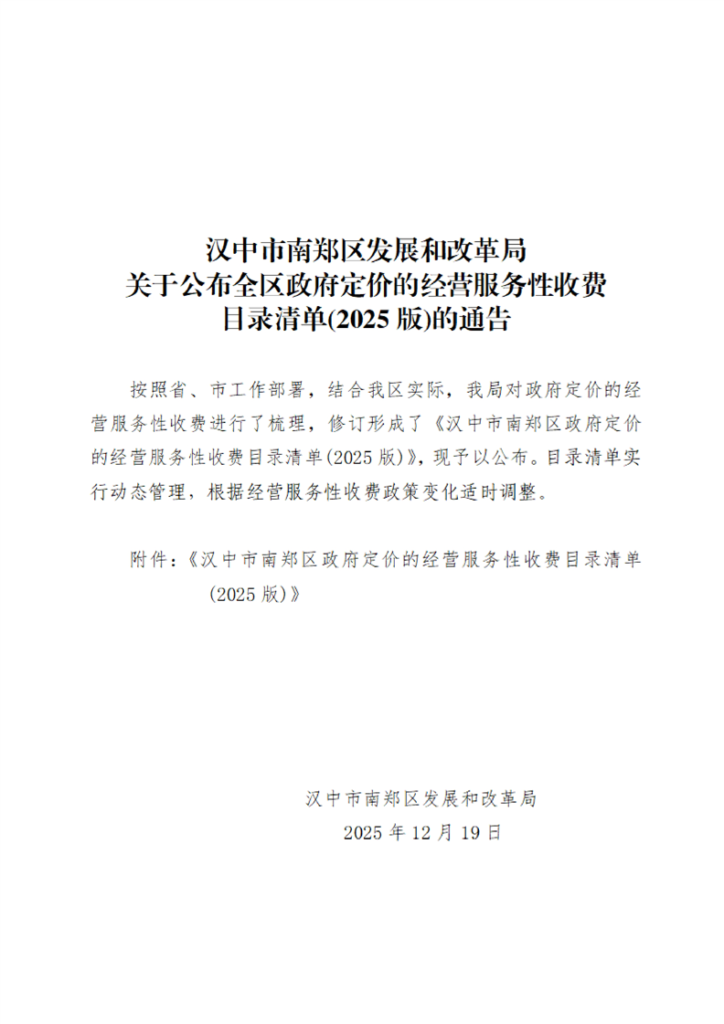 汉中市南郑区发展和改革局关于公布全区政府定价的经营服务性收费目录清单(2025版)的通告