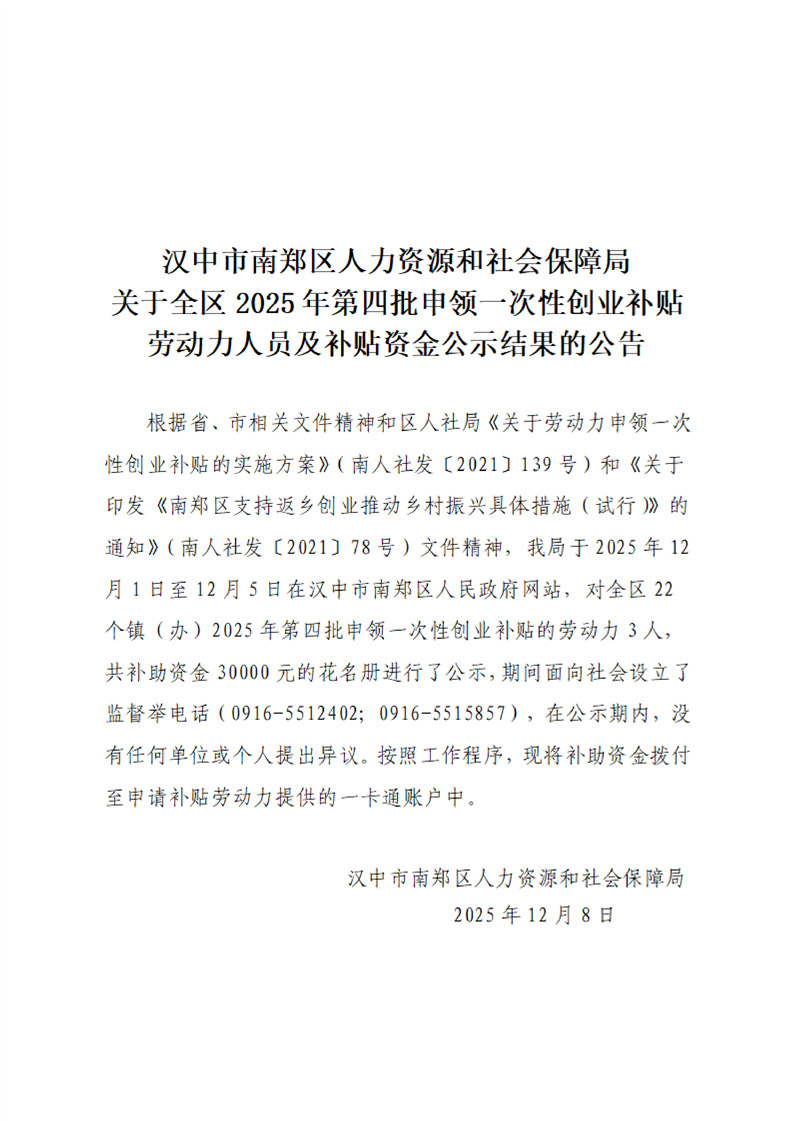 汉中市南郑区人力资源和社会保障局关于全区2025年第四批申领一次性创业补贴劳动力人员及补贴资金公示结果的公告