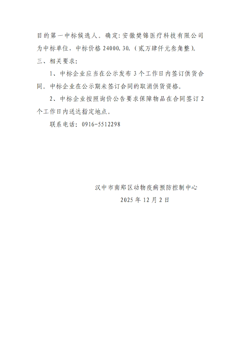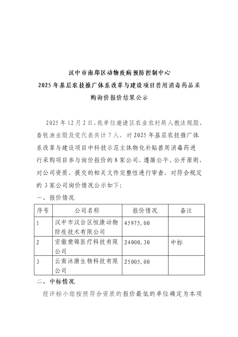 汉中市南郑区动物疫病预防控制中心2025年基层农技推广体系改革与建设项目兽用消毒药品采购询价报价结果公示