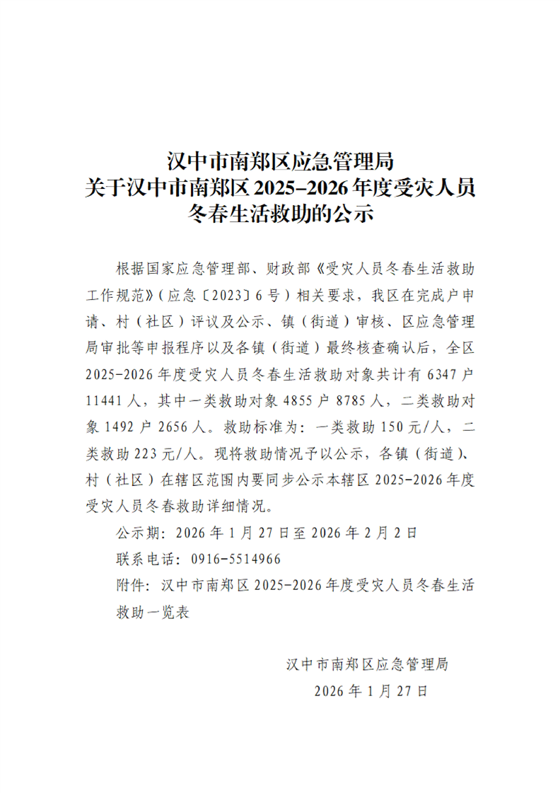 汉中市南郑区应急管理局关于汉中市南郑区2025-2026年度受灾人员冬春生活救助的公示
