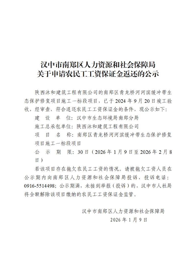 汉中市南郑区人力资源和社会保障局关于申请农民工工资保证金返还的公示