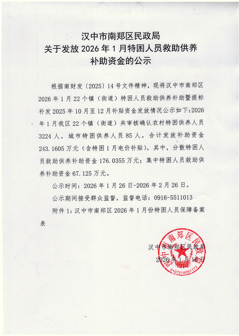 关于发放2026年1月特困人员救助供养补助资金的公示