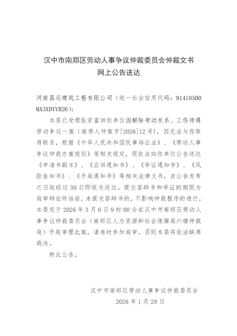 汉中市南郑区劳动人事争议仲裁委员会仲裁文书网上公告送达