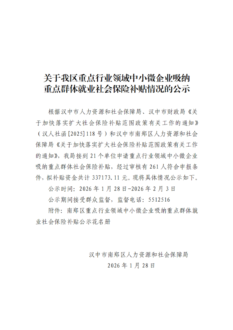 关于我区重点行业领域中小微企业吸纳重点群体就业社会保险补贴情况的公示