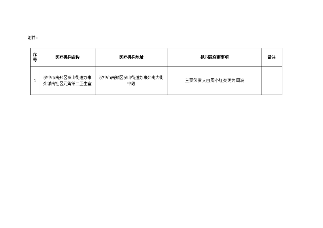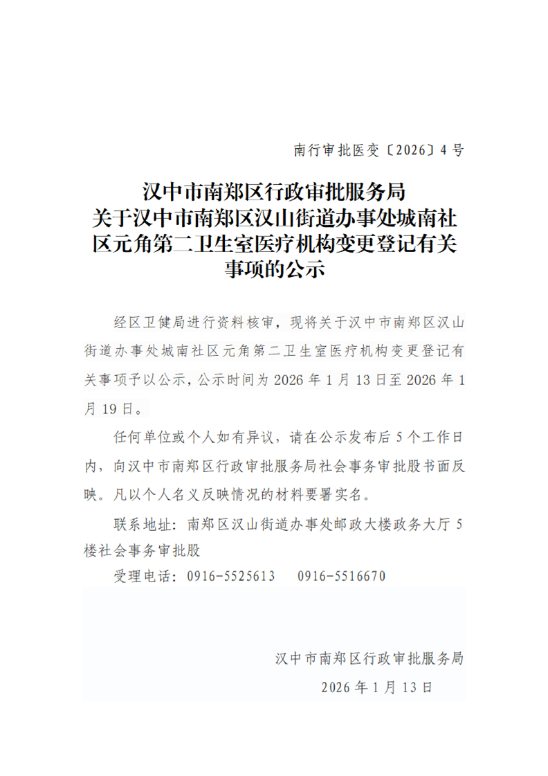 汉中市南郑区行政审批服务局关于汉中市南郑区汉山街道办事处城南社区元角第二卫生室医疗机构变更登记有关事项的公示