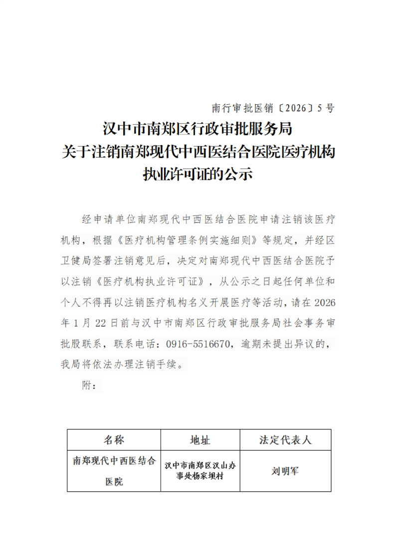 汉中市南郑区行政审批服务局关于注销南郑现代中西医结合医院医疗机构执业许可证的公示
