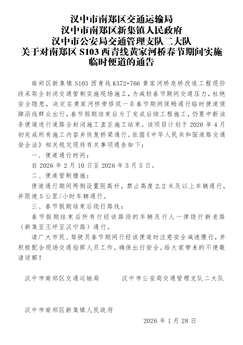 关于对南郑区S103西青线黄家河桥春节期间实施临时便道的通告