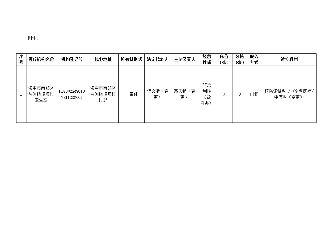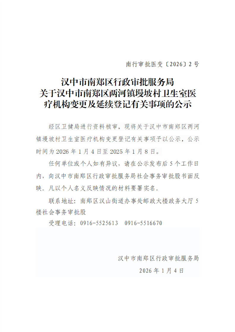 汉中市南郑区行政审批服务局关于汉中市南郑区两河镇墁坡村卫生室医疗机构变更及延续登记有关事项的公示
