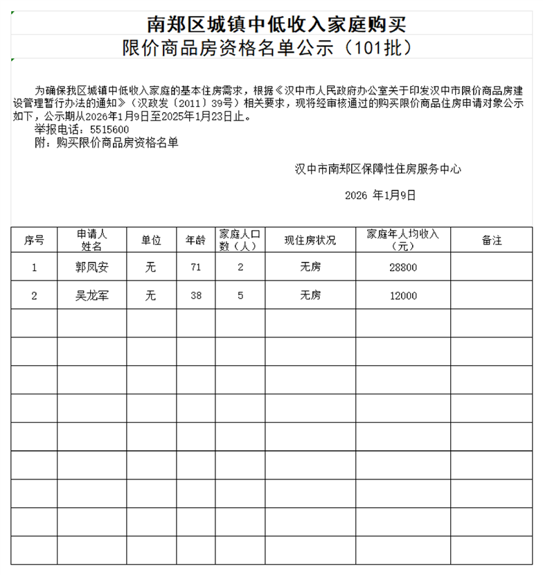 南郑区城镇中低收入家庭购买限价商品房资格名单公示(101批)