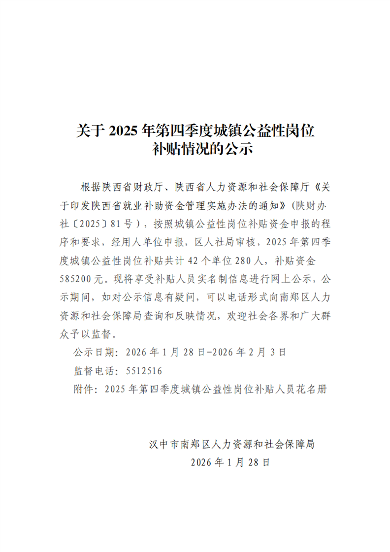 关于2025年第四季度城镇公益性岗位补贴情况的公示