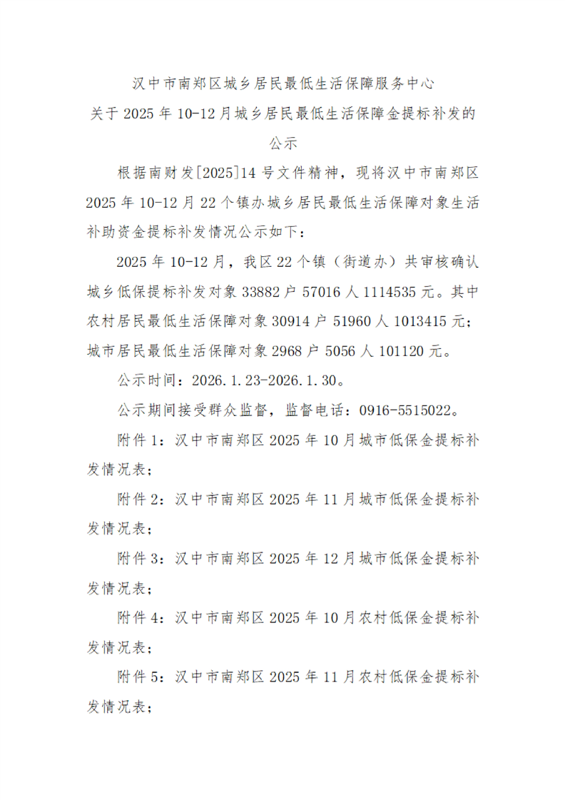 汉中市南郑区城乡居民最低生活保障服务中心关于2025年10-12月城乡居民最低生活保障金提标补发的公示