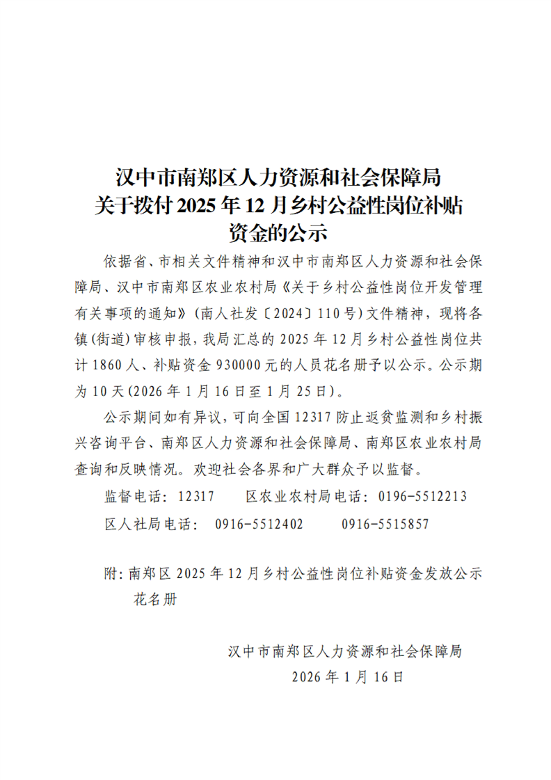汉中市南郑区人力资源和社会保障局关于拨付2025年12月乡村公益性岗位补贴资金的公示