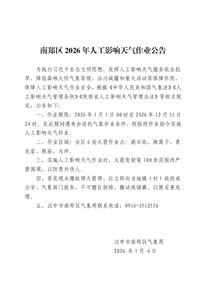 南郑区2026年人工影响天气作业公告