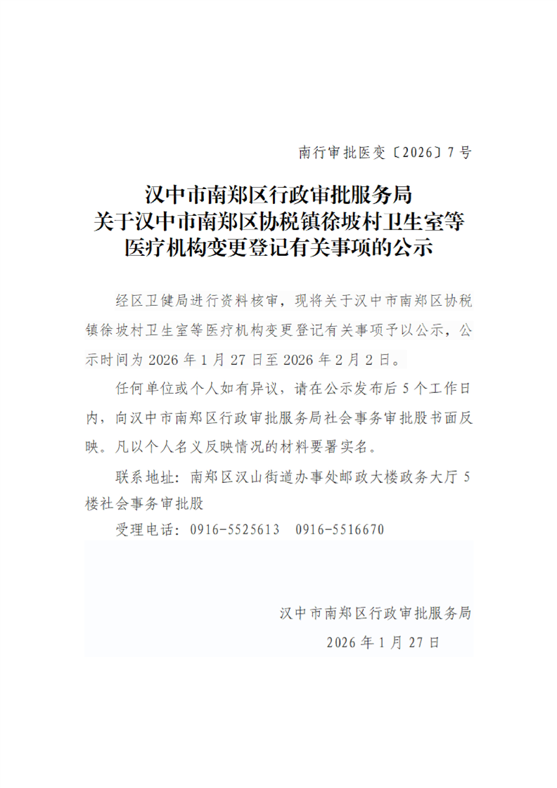 汉中市南郑区行政审批服务局关于汉中市南郑区协税镇徐坡村卫生室等医疗机构变更登记有关事项的公示